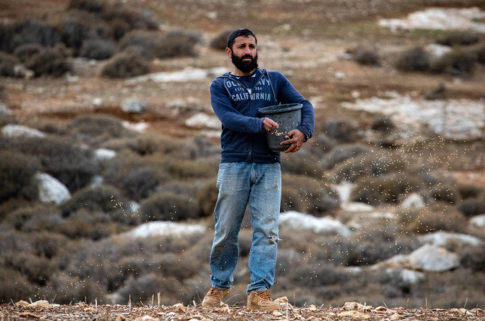 January 4th, 2025 – Palestinian farmers from the town of Mukhmas in the West Bank plow and sow their lands situated between the colonial outposts of ‘Sdeh Yonatan’ and ‘Nachalat Zvi.’ Last night, settlers plowed a portion of the town’s lands in an attempt to seize control. This tactic, commonly employed by settlers during the plowing season, aims to establish de facto control over the land. Photo: Avishay Mohar / Activestills