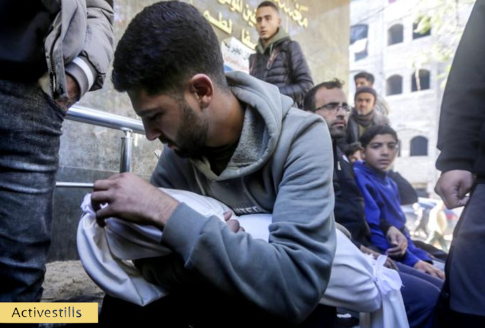 20 décembre 2025 – Un Palestinien serre dans ses bras son enfant à l’hôpital Al-Shifa de Gaza, tué lors d’une frappe israélienne qui a visé une école abritant des personnes déplacées dans le quartier de Shujayea, à l’est de la ville de Gaza. Au moins six personnes ont été tuées lors de cette frappe. Malgré le soi-disant cessez-le-feu, Israël poursuit ses attaques contre Gaza – Photo : Yousef Zaanoun / Activestills