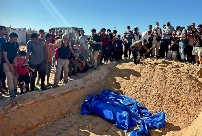 18 septembre 2024 – 88 Palestiniens non identifiés sont enterrés dans une fosse commune à Khan Yunis, un jour après que les forces coloniales israéliennes aient rendu les corps, sévèrement décomposés et sans aucune identification. Aucune famille n’a pu les réclamer et il n’y a aucune information sur les circonstances de leur mort. A cette date, la campagne génocidaire israélienne a déjà tué plus de 41 500 Palestiniens à Gaza – principalement des femmes et des enfants – depuis le 7 octobre 2023. Plusieurs milliers de personnes sont encore ensevelies sous les décombres, et le nombre de morts risque d’être encore bien plus élevé – Photo : Doaa Albaz / Activestills