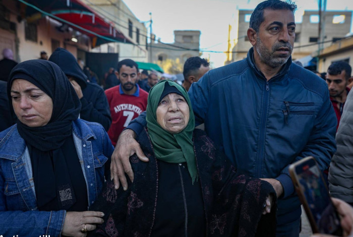 9 décembre 2024 – Des Palestiniens font leurs adieux à leurs proches tués par les forces coloniales israéliennes lors de frappes aériennes visant un groupe de civils dans le camp de réfugiés d’Al-Bureij à Deir al-Balah, dans le centre de la bande de Gaza. L’attaque a fait au moins 25 morts et a fait de nombreuses blessures. Les attaques génocidaires des forces coloniales israéliennes contre Gaza ont tué au moins 44 612 Palestiniens, et beaucoup plus de milliers sont toujours portés disparus – Photo : Yousef Al-Zanoun / Activestills