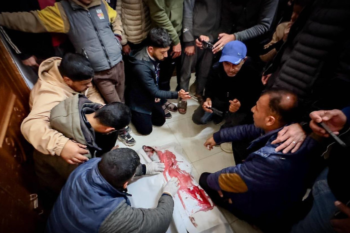 3 mars 2025 – Les Palestiniens pleurent la mort de Musa Qishta et Khaled Al-Shaer, dont les corps gisent au Nasser Medical Complex de Khan Yunis après avoir été tués dans une attaque de quadcoptères par les forces coloniales israéliennes dans la ville de Rafah. Depuis l’entrée en vigueur du cessez-le-feu entre Israël et le Hamas le 19 janvier, au moins 116 Palestiniens ont été tués par les forces israéliennes dans la bande de Gaza – Photo : Doaa Albaz / Activestills