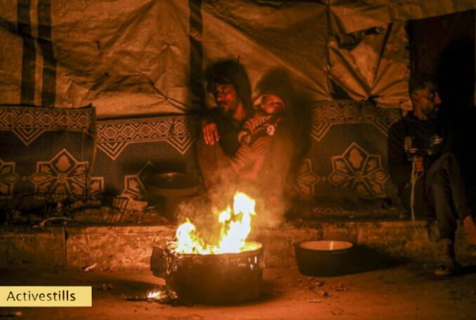 23 janvier 2026 - Une famille palestinienne déplacée dans la rue Rashid à Gaza allume un feu pour se réchauffer devant sa tente. Le blocus continu imposé par Israël, qui empêche l'acheminement des produits de première nécessité dans la bande de Gaza, oblige les habitants à utiliser du bois plutôt que du gaz pour cuisiner et se chauffer, ce qui provoque des problèmes respiratoires et augmente les risques d'incendie. Au début du mois, un enfant et sa grand-mère sont morts lorsque leur tente a pris feu alors qu'ils préparaient le dîner. Malgré le cessez-le-feu, la plupart des Palestiniens de Gaza restent déplacés et font face à des conditions de vie catastrophiques, exacerbées par l'hiver - Photo : Yousef Zaanoun / Activestills