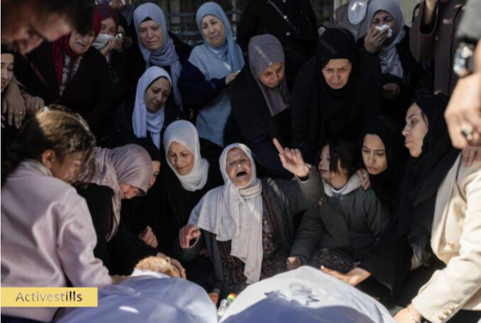 3 mars 2026 - Des Palestiniens pleurent lors des funérailles des frères Mohammed et Fahim Mu'amer, âgés respectivement de 52 et 48 ans, qui ont été assassinés par des colons israéliens à la suite d'une attaque perpétrée la veille contre le village de Qaryut, au sud de Naplouse, en Cisjordanie. Ces meurtres s'inscrivent dans le contexte de violences persistantes commises par les colons en Cisjordanie - Photo : Oren Ziv / Activestills