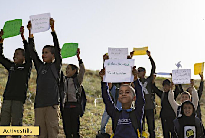 19 avril 2026 - Les enfants de Khirbet Umm al-Khair, un village situé à Masafer Yatta, dans le sud de la Cisjordanie, poursuivent leur manifestation contre la fermeture de la route menant à leur école, barrière érigée par des colons la semaine dernière. Les colons ont installé des barbelés tranchants comme des lames de rasoir, empêchant les enfants de se rendre à l'école depuis une semaine. Cette action s'inscrit dans le cadre des attaques et du harcèlement dont sont victimes les habitants d'Umm al-Khair et d'autres villages, alors que la politique israélienne de déplacement et de nettoyage ethnique se poursuit, violant le droit fondamental des enfants à l'accès à l'éducation - Photo : Mosab Shawer / Activestills
