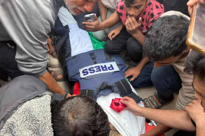 13 mai 2025 – Les proches pleurent la mort du journaliste palestinien Hassan Eslaih, tué lors d’une attaque israélienne contre le complexe médical Nasser à Khan Younis, dans la bande de Gaza, le 13 mai 2025 – Photo : Alaa YM Abumohsen / Anadolu