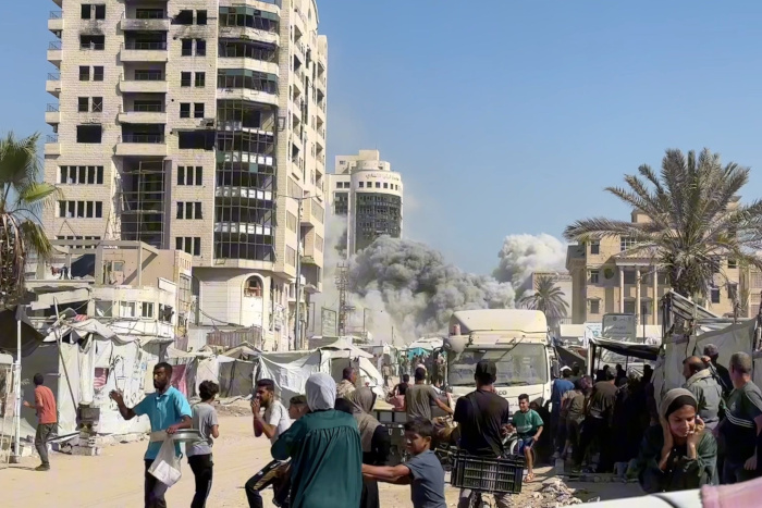 7 septembre 2025 – Des frappes aériennes israéliennes visent la tour résidentielle Al-Rouya dans la ville de Gaza – Capture d’écran, vidéo Abdel Qader Sabbah