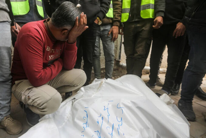 21 janvier 2026 - Les Palestiniens de l'hôpital Al-Shifa de Gaza City pleurent trois journalistes — Anas Ghunaim, Abdelraouf Shaat et Muhammad Qishta — tués par une frappe aérienne israélienne. Les trois hommes ont été tués lors d'une attaque ciblée contre leur voiture alors qu'ils étaient en mission dans le centre de Gaza pour le compte du Comité égyptien de secours - Photo : Yousef Zaanoun / ActiveStills