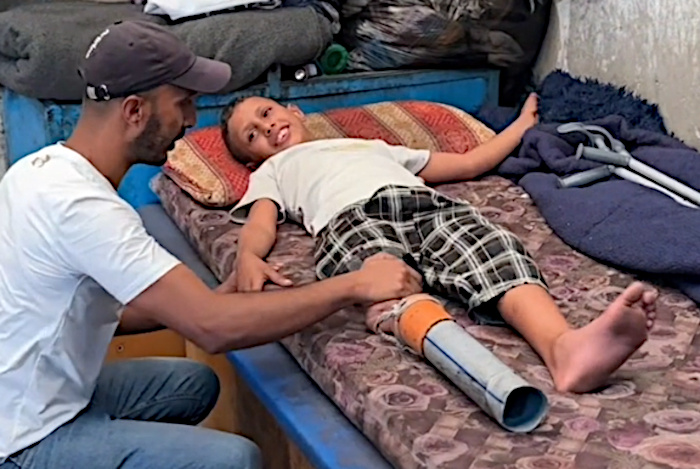 Deir al-Balah, novembre 2025 – Rateb Abu Qleiq, âgé de 10 ans, s’est fabriqué une prothèse de fortune à partir d’un tuyau d’égout en plastique après avoir été amputé de la jambe droite à la suite d’une frappe aérienne israélienne – Photo : extrait vidéo Abdel Qader Sabbah