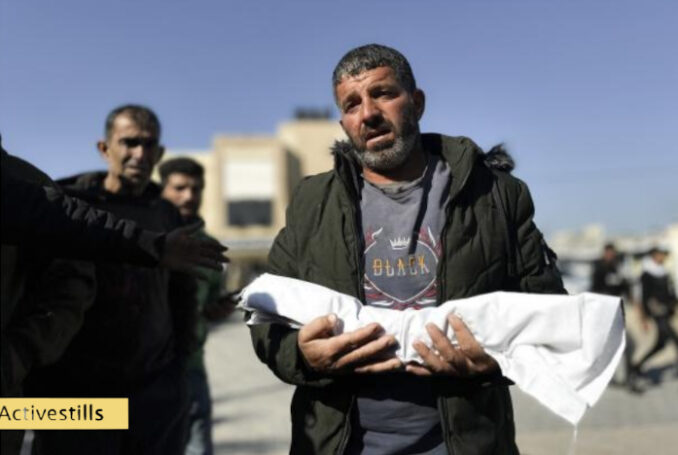 18 décembre 2025 - Assad Abdeen porte le corps de son fils âgé d'un mois, Saeed, à l'hôpital Al-Nasser de Khan Yunis, le 18 décembre 2025. Le bébé est mort après avoir été exposé au froid et à de fortes baisses de température dans la tente où vit sa famille déplacée, qui n'est pas adaptée à des conditions météorologiques aussi difficiles. La grande majorité des Palestiniens de Gaza sont toujours déplacés et vivent une situation humanitaire catastrophique, aggravée par les conditions hivernales rigoureuses. A cette date, le nombre de décès dans les hôpitaux dus à la dépression atmosphérique et au froid intense dans la bande de Gaza est passé à 13 - Photo : Doaa Albaz / Activestills