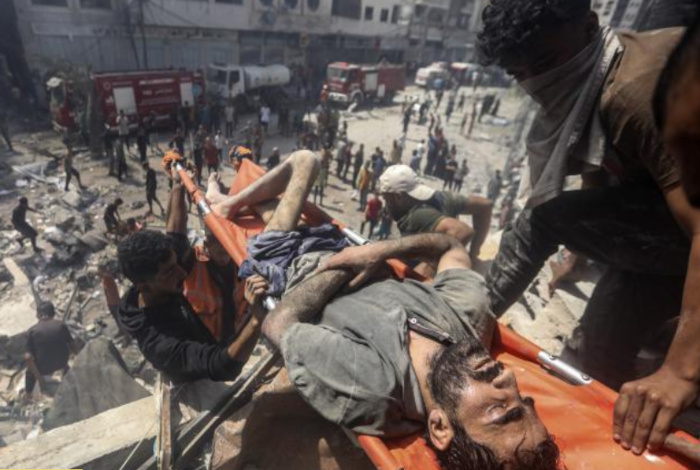 22 septembre 2025 – Des équipes de la défense civile et des habitants transportent un Palestinien blessé hors des décombres après que des frappes aériennes israéliennes ont visé une maison appartenant à la famille Al-Shawa près du carrefour Samer dans la ville de Gaza, le 22 septembre 2025. Les rapports font état de plusieurs morts et blessés. La frappe a provoqué un incendie dans le bâtiment visé et détruit complètement une structure voisine. L’attaque s’est produite dans le cadre d’une vaste campagne israélienne de bombardements sur la ville de Gaza, forçant les habitants à fuir vers le sud – Photo : Yousef Zaanoun / Activestills