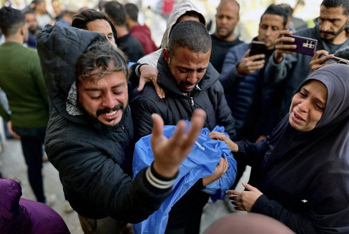 3 avril 2025 – Une frappe israélienne à Khan Yunis, a tué 7 membres de la famille Sharab, dont un enfant et trois femmes. Au moins 26 Palestiniens ont été tués dans plusieurs bombardements israéliens sur Khan Younis le matin du même jour, dont une frappe aérienne sur la zone prétendument « humanitaire » d’al-Mawasi – Photo : Doaa AlBaz / Activestills