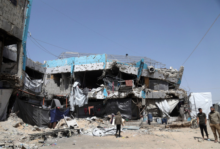 2 avril 2025 – Bâtiment de l’UNRWA après qu’il a été touché par une frappe israélienne, dans le camp de réfugiés de Jabalia, au nord de la bande de Gaza. La frappe, qui a eu lieu la veille sur un centre de santé abritant des Palestiniens déplacés, a tué au moins 19 personnes, dont 9 enfants. Dans une déclaration officielle, l’UNRWA a indiqué que depuis le début de l’attaque génocidaire d’Israël contre Gaza, plus de 300 bâtiments de l’ONU ont été endommagés ou complètement détruits, alors que toutes leurs coordonnées sont régulièrement communiquées aux parties belligérantes, et que plus de 700 personnes ont été tuées alors qu’elles cherchaient à se mettre sous la protection de l’ONU. – Photo : Yousef Zaanoun / Activestills