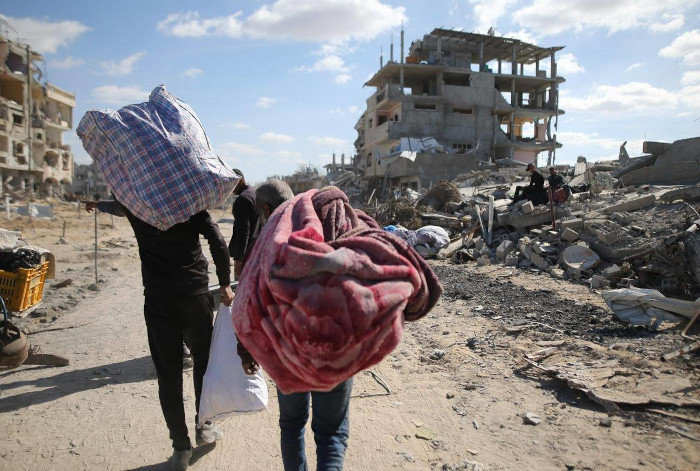 20 janvier 2024 – Suite à un accord de cessez-le-feu, les Palestiniens déplacés retournent à ce qui reste de leurs maisons à Rafah, dans le sud de Gaza, transportant leurs quelques affaires et marchant à travers des scènes apocalyptiques de dévastation causées par les bombardements israéliens. Deux Palestiniens, dont un adolescent, ont été tués et plusieurs autres blessés par des tirs israéliens à Rafah aujourd’hui, malgré la trêve. Les attaques génocidaires d’Israël contre Gaza ont tué plus de 47 000 Palestiniens et détruit ou endommagé environ 92 % des habitations. Selon la défense civile de Gaza, plus de 10 000 corps restent coincés sous les décombres des bâtiments détruits – Photo : Yousef Al-Zanoun / Activestills