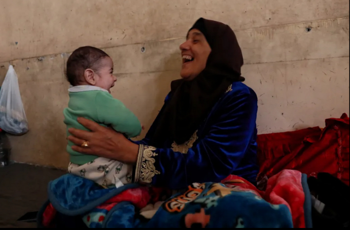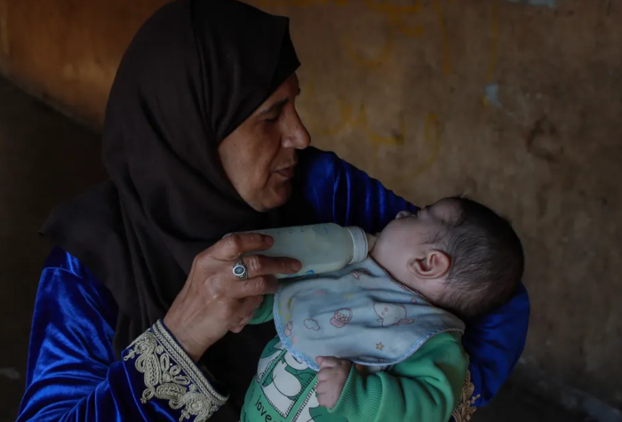 Maha, 56 ans, tient dans ses bras Hamza, un petit garçon orphelin de six mois qu’elle a adopté. Elle avait déjà élevé son père, Omar, devenu orphelin lors de la guerre de Gaza en 2008, et elle élève désormais Hamza depuis qu’Omar et sa femme Diana ont été tués l’année dernière lors d’une frappe aérienne israélienne - Photo : Abdelhakim Abu Riash / Al Jazeera