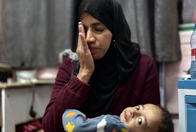 21 mars 2025 - Une mère en larmes s'occupe de son enfant malade au complexe médical Nasser à Khan Younis - Photo : Doaa Albaz / Activestills