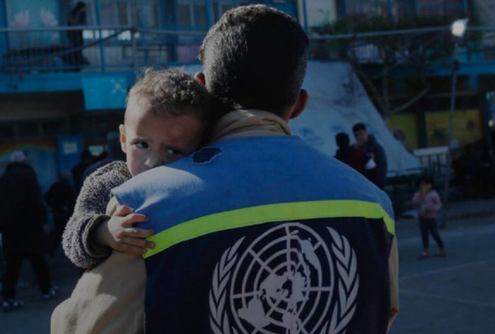 Intervenant de l’UNRWA transportant dans ses bras un enfant blessé dans un combardement israélien – L’UNRWA est à nouveau la cible d’Israël et de ses supports occidentaux, dans le but de fragiliser et précariser au maximum la situation des Palestiniens – Photo : UNRWA