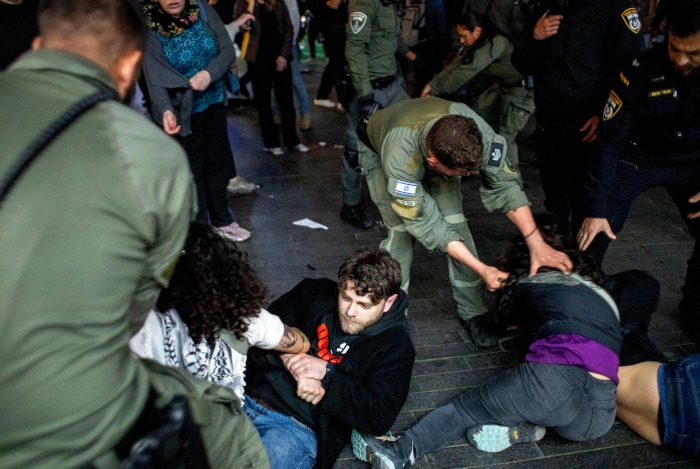 18 mars 2025 – Jérusalem – Les forces coloniales israéliennes ont violemment attaqué des manifestants, blessant plusieurs personnes, lors d’une manifestation contre le génocide et les nouveaux bombardements à Gaza qui ont tué des centaines de Palestiniens en une nuit. Des pancartes sur lesquelles était écrit le mot « génocide » ont été immédiatement confisquées par des policiers israéliens – Photo : Avishay Mohar / Activestills