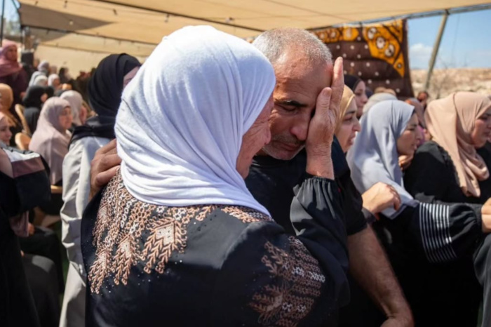25 septembre 2025 – Les funérailles de Saeed Al-Nassan, âgé de 20 ans, ont eu lieu dans la ville d’Al-Mughayyer, à l’est de Ramallah, en Cisjordanie, après qu’il ait été tué par des tirs de colons lors d’un raid sur le village. Les colons israéliens ont ouvert le feu sur les participants aux funérailles et les photographes présents, mais n’ont par chance touché personne – Photo : Wahaj Bani / Avtivestills