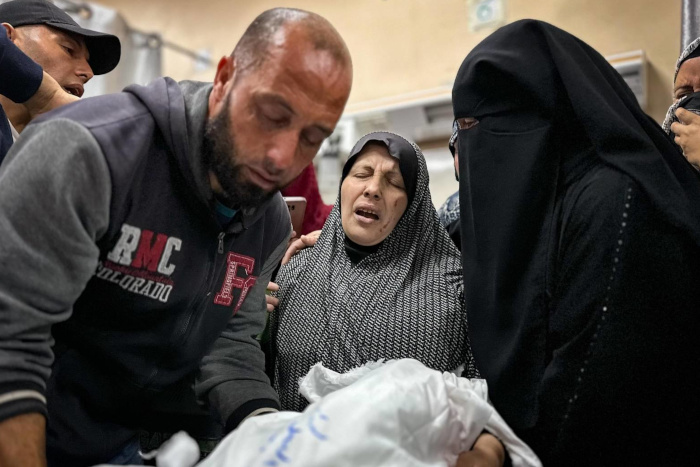 15 mai 2025 – À l’occasion du 77e anniversaire de la Nakba, un enfant est le seul survivant de la famille Al-Bayouk après que leur maison a été prise pour cible pendant la nuit à Khan Yunis, dans la bande de Gaza. À l’hôpital Al-Nasser, la mère, Safaa Al-Bayouk, fait ses adieux à ses fils jumeaux, Moaz et Moataz, qu’elle a mis au monde il y a neuf ans. Le père a également été blessé lors de l’attaque israélienne. Au total, dix personnes ont été tuées ou blessées parmi les familles Al-Zainati, Samour et Al-Bayouk. Leur maison de trois étages a été complètement détruite, les corps des victimes ont été déchiquetés – Photo : Doaa Albaz / Activestills