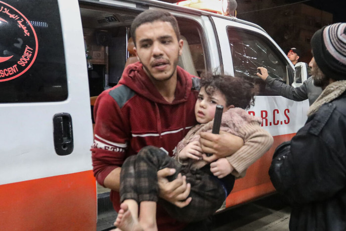 Photo : Ahmad Hasaballah Un enfant palestinien blessé par une frappe aérienne israélienne est amené à l’hôpital Nasser le 25 décembre 2023 à Khan Younis, Gaza – Photo : Ahmad Hasaballah