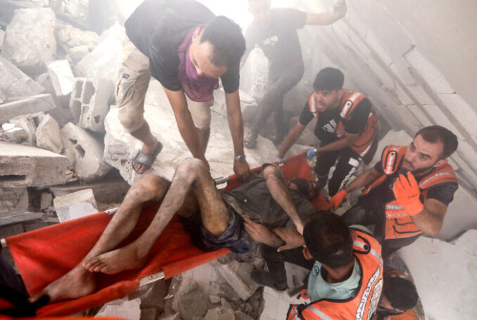 22 septembre 2025 - Des équipes de la défense civile et des habitants extraient un blessé dessous les décombres après que des frappes aériennes israéliennes ont visé une maison appartenant à la famille al-Shawa dans la ville de Gaza. La frappe a provoqué un incendie dans le bâtiment visé et détruit complètement une structure voisine - Photo : Yousef Zaanoun / ActiveStills