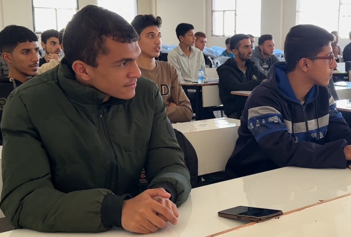 1er décembre 2025 – Des étudiants universitaires assistent à des cours en présentiel à l’université islamique de Gaza. – Capture d’écran d’une vidéo d’Abdel Qader Sabbah
