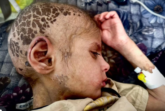 28 septembre 2025 – La petite Mia Abu Arar, âgée de 7 ans, reçoit des soins médicaux à l’hôpital Al-Nasser de Khan Younis, dans la bande de Gaza, après avoir perdu la capacité de marcher et ses cheveux à cause de l’épuisement, de l’atrophie et des plaies dues à la malnutrition – Photo : Doaa Albaz / Activestills