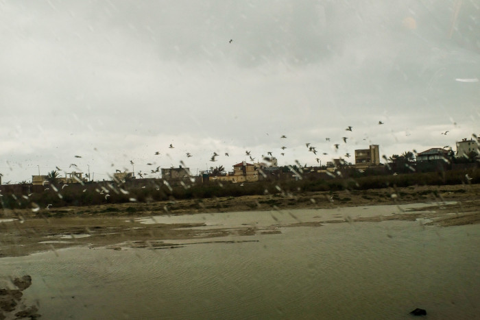 Camp de réfugiés du nord de Nuseirat, Gaza. 12 mars 2022 – Les oiseaux volent au-dessus du Wadi Gaza, le plus souvent aride, pendant un jour de pluie – Photo: Mahmoud Nasser / The Palestine Chronicle