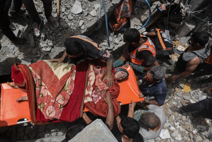 17 mai 2025 – Les équipes de la défense civile et les habitants de ce qu’il subsiste du quartier, mènent des opérations de recherche et de sauvetage dans là où l’attaque israélienne a eu lieu dans la région de Jabalia, dans le nord de la bande de Gaza – Photo : Abdalhkem Abu Riash / Anadolu