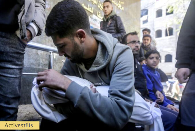 20 décembre 2025 - Un Palestinien serre dans ses bras son enfant à l'hôpital Al-Shifa de Gaza, tué lors d'une frappe israélienne qui a visé une école abritant des personnes déplacées dans le quartier de Shujayea, à l'est de la ville de Gaza. Au moins six personnes ont été tuées lors de cette frappe. Malgré le soi-disant cessez-le-feu, Israël poursuit ses attaques contre Gaza - Photo : Yousef Zaanoun / Activestills