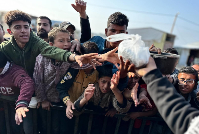 11 mars 2025 – Des Palestiniens se pressent autour de Tekiyat al-Saada (cuisine solidaire) à Khan Yunis pour recevoir des repas Iftar pendant le mois sacré du Ramadan. Depuis des jours, Israël bloque l’approvisionnement de Gaza en nourriture et autres aides humanitaires. Après avoir coupé toute aide, Israël a également coupé l’électricité à Gaza, aggravant encore la crise humanitaire – Photo : Doaa Albaz / Activestills