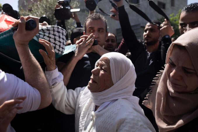 13 avril 2022 - Des personnes en deuil portent le corps de Muhammad Assaf lors de ses funérailles dans le village de Kafr Laqif, en Cisjordanie. Assaf, avocat, a été abattu par les forces israéliennes lors d'un raid à l'aube à l'est de Naplouse - Photo : Oren Ziv / ActiveStills