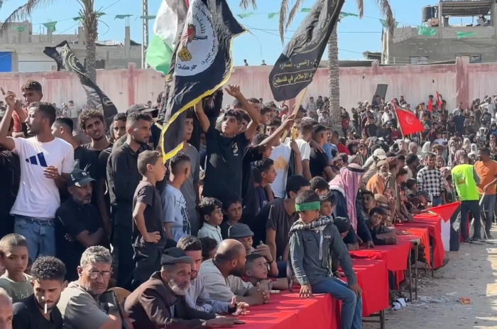 13 octobre 2025 – La foule attend les prisonniers palestiniens libérés avant leur arrivée à l’hôpital Nasser de Khan Younis – Capture d’écran vidéo Abdel Qader Sabbah