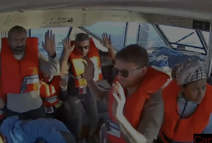2 octobre 2025 – Une capture d’écran montre des militants à bord d’un navire de la flottille Global Sumud levant les mains pour prouver qu’ils n’étaient pas armés, alors que les forces navales israéliennes continuent d’attaquer les navires de la flottille Global Sumud qui naviguent vers Gaza pour briser le blocus et livrer de l’aide humanitaire, en mer Méditerranée – Flottille Global Sumud – Image : AA