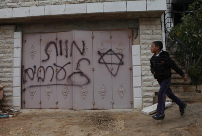 23 novembre 2014 – Un garçon palestinien passe devant un graffiti en hébreu sur lequel on peut lire « Mort aux Arabes », écrit par des colons israéliens sur la porte de la maison de la famille Hamayel, dans le village palestinien d’Abu Falah, au nord-est de Ramallah – Photo : Shadi Hatem