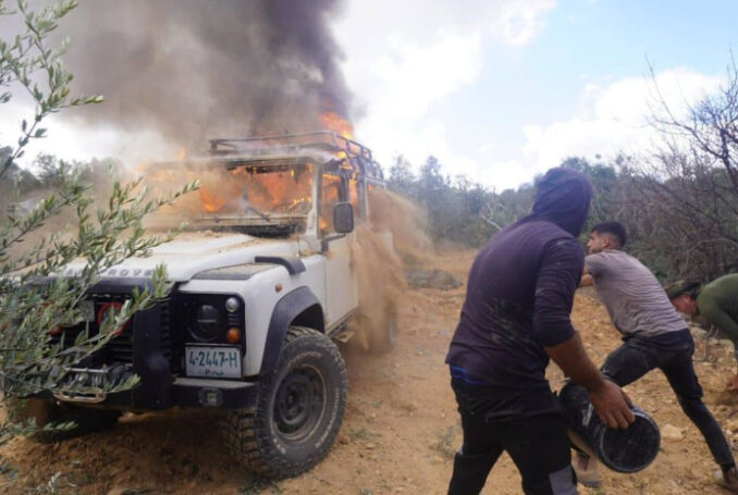 10 octobre 2025 - Des Palestiniens éteignent un incendie de véhicule provoqué lors d'une attaque menée par des colons israéliens contre des Palestiniens qui récoltaient des olives dans le village de Beita, en Cisjordanie - Photo : Rafaela Cortez et Ricardo Esteves Ribeiro