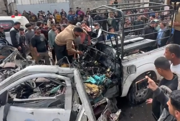 Après une frappe aérienne israélienne contre un véhicule de police dans la rue Al-Nafaq, à Gaza, le 14 avril 2026 – Extrait de la vidéo de Mohammed Ahmed