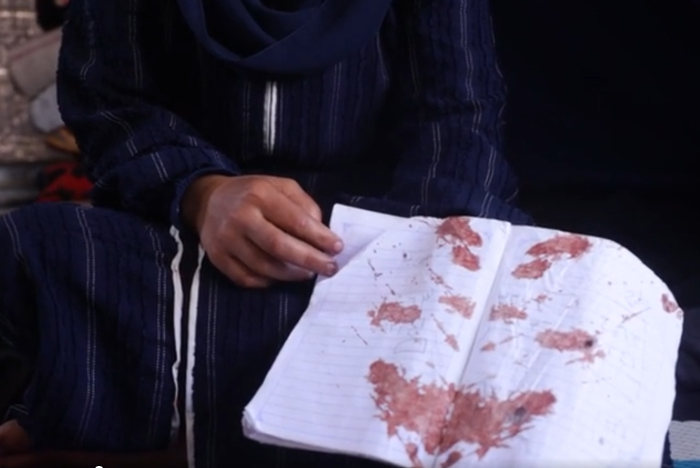 La mère de Ritaj Rihan montre le cahier d’école de sa fille après qu’elle a été tuée dans la tente de l’école Abu Ubaida Ibn Al-Jarrah à Beit Lahia, le 9 avril 2026 – Extrait de la vidéo de Mohammed Ahmed
