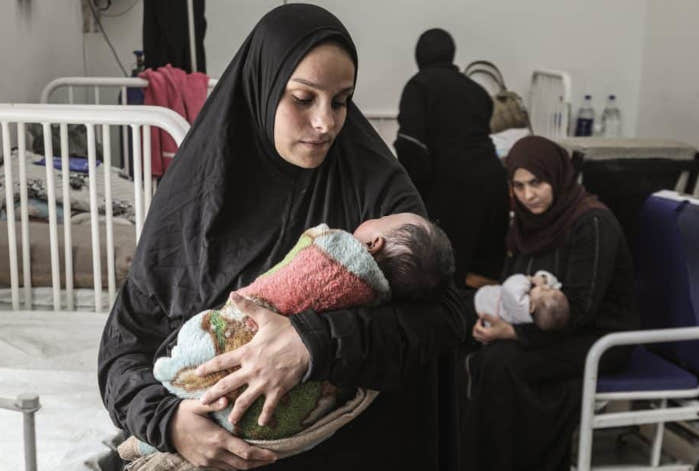28 mars 2026 – Asmeen al-Jamala tient dans ses bras son fils nouveau-né, Adam al-Ustaz, qui est soigné à l’hôpital pédiatrique al-Rantisi de la ville de Gaza après avoir été mordu par un rat dans une tente de réfugiés – Photo : Moiz Salhi