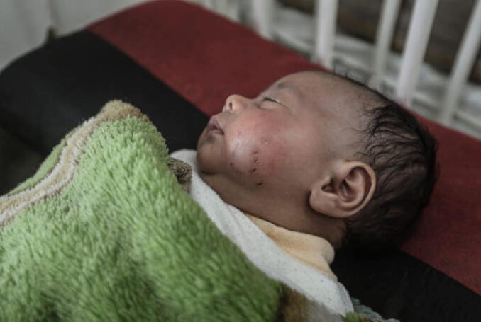 28 mars 2026 - Le nouveau-né Adam al-Ustaz est soigné à l'hôpital pédiatrique al-Rantisi de la ville de Gaza après avoir été mordu par un rat dans une tente de réfugiés - Photo : Moiz Salhi
